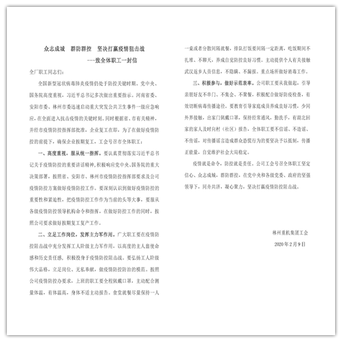 會議根據(jù)林州市委、市政府部署,及時推遲公司復(fù)工時間,并成立林州重機疫情防控工作領(lǐng)導(dǎo)小組及四個保障小組,全 面動員和落實疫情防控工作。