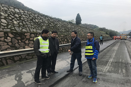 圖為市公路局副局長(zhǎng)童桂正一行在現(xiàn)場(chǎng)指導(dǎo)