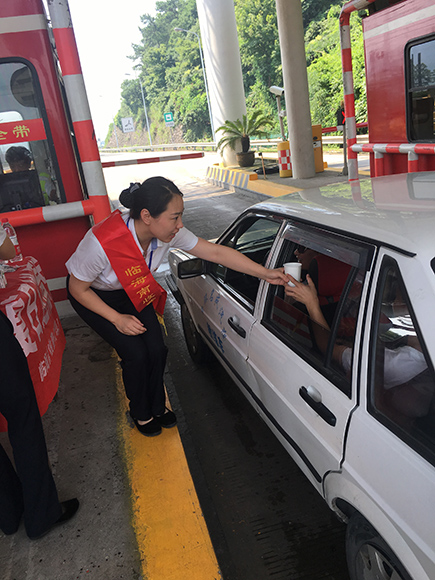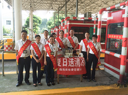 圖為工作人員合影 活動(dòng)當(dāng)天,該所在車道安全島內(nèi)搭起臨時(shí)“便民服務(wù)臺(tái)”,不僅免費(fèi)為司乘人員提供綠豆湯、礦泉水等消暑食品,還備足藿香正氣水、風(fēng)油精、清涼油、花露水等解暑降溫藥品?;顒?dòng)中,大家身披橫幅,面帶微笑,向途經(jīng)收費(fèi)所的司機(jī)遞上一杯杯綠豆湯、一瓶瓶礦泉水。同時(shí),大家還不忘宣傳行車安全注意事項(xiàng),提醒司機(jī)朋友在高溫酷暑時(shí)節(jié)多注意安全。司機(jī)朋友們不時(shí)露出欣喜的笑容,連連稱謝。 臨海南收費(fèi)所通過開展“夏日送清涼”活動(dòng),不僅給廣大司乘人員在酷暑中送去絲絲涼意和關(guān)心,更加促進(jìn)了收費(fèi)員與司乘人員之間的溝通交流,拉近距離,從而贏得了過往司乘人員的好評(píng),塑造了良好的窗口形象。 陳瑩