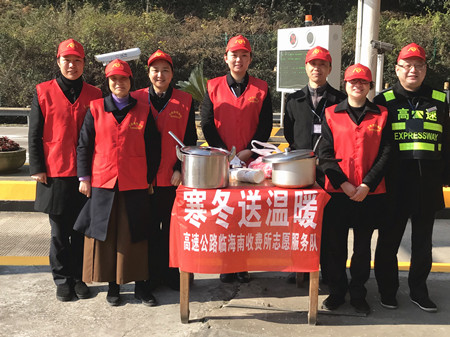 1月12日上午,臨海南收費(fèi)所的收費(fèi)員們走出崗?fù)?,開展了一場“寒冬送溫暖”活動。