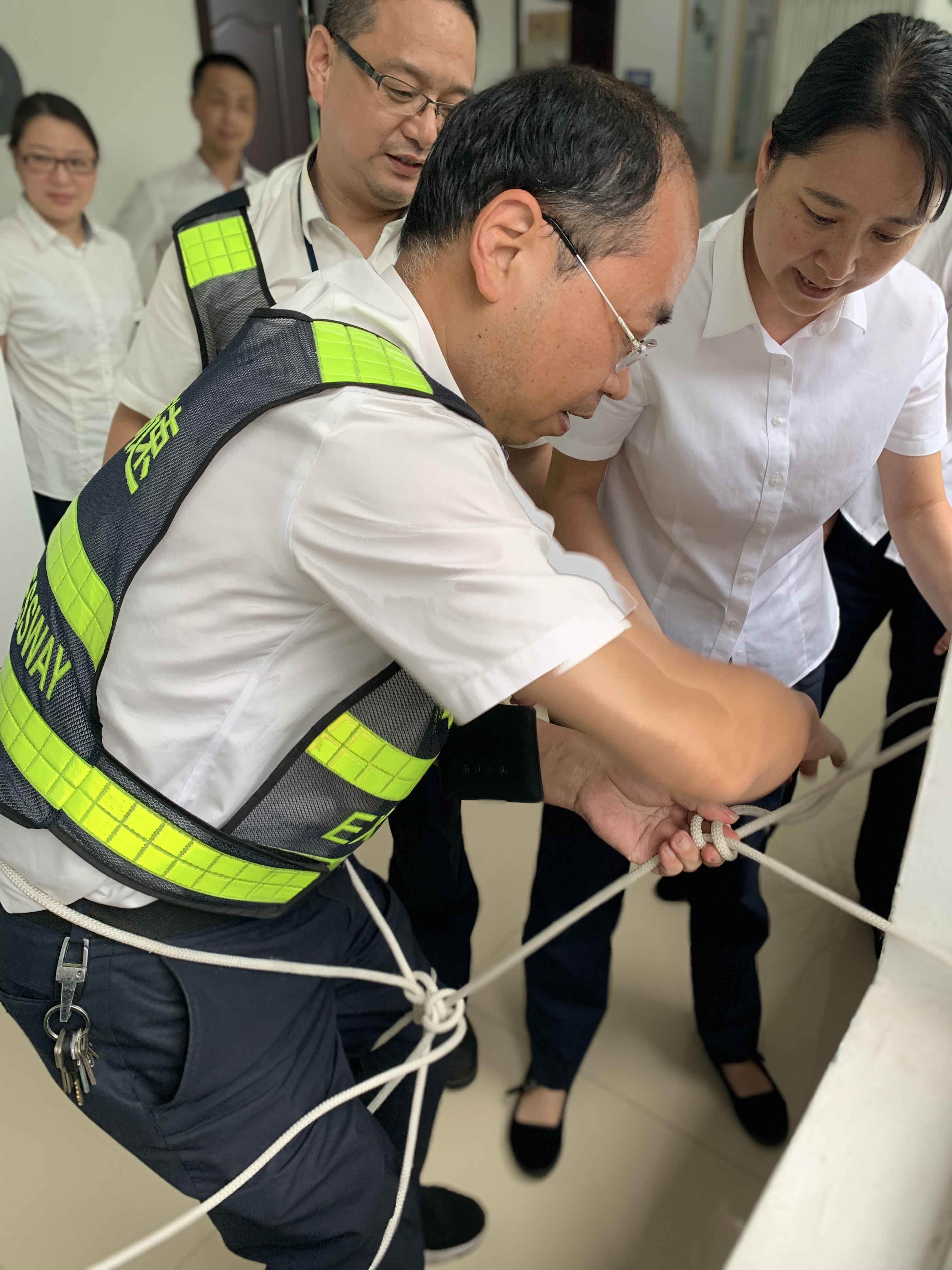 “繩”采飛揚(yáng) ——記臨海南收費(fèi)所逃生繩技能大比武活動(dòng) “加油、加油!” “快快快,繩子給我,輪到我啦!” “不對(duì)不對(duì),繞三圈從中間穿過去!” 臨海南收費(fèi)所辦公樓二樓樓道上,不時(shí)傳出陣陣掌聲、吶喊聲,7月15日至7月17日,該所以各收費(fèi)班組為參賽單位,以“增強(qiáng)消防安全意識(shí),提升應(yīng)急逃生技能”為主題,開展逃生繩技能大比武活動(dòng)。