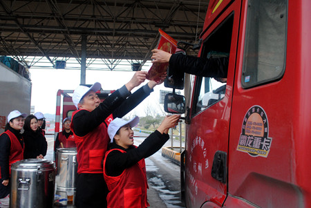 圖為志愿者給過(guò)往司機(jī)送上臘八粥