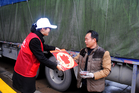圖為志愿者給司機(jī)送上印有出入平安的“?!弊?/span>