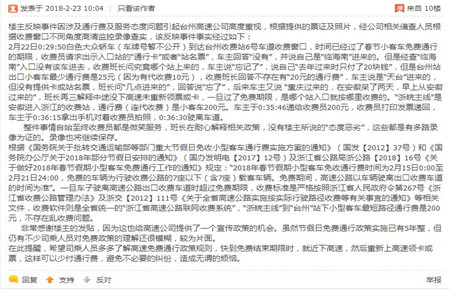 集團(tuán)對(duì)此事件高度重視,當(dāng)即調(diào)取當(dāng)時(shí)多路監(jiān)控錄像,還原了事件真相。2月22日凌晨0:29:50,投訴人駕駛小轎車進(jìn)入臺(tái)州所6號(hào)車道,時(shí)間已經(jīng)過了春節(jié)小客車免費(fèi)通行的期限,收費(fèi)員黃智超請(qǐng)求出示入口站的通行卡或者紙質(zhì)繳費(fèi)憑證,車主回答無卡無票,聲稱自己是從臨海南上進(jìn)入高速。經(jīng)查證,臨海南并沒有該車的入口信息。收費(fèi)班長再次詢問時(shí),車主說“忘記了”,說自己“去年過來時(shí)只付了20塊錢”,但是臺(tái)州站出口小客車最少通行費(fèi)是25元(因?yàn)橛写召M(fèi)10元),收費(fèi)班長回答不存在有“20元的通行費(fèi)”,司機(jī)忽而改口說是天臺(tái)進(jìn)入的,忽而想了一下又說是重慶過來的,在安徽呆了兩天,當(dāng)天早上從安徽上的高速。班長再三解釋中途沒下高速未重新領(lǐng)票或卡,一旦過了免費(fèi)期限,是哪個(gè)站入口就按哪里收費(fèi)的。“浙皖主線”是安徽進(jìn)入浙江的收費(fèi)站,通行費(fèi)(連代收費(fèi))是小客車200元。車主于0:35:46遞給收費(fèi)員200元,收費(fèi)員打印發(fā)票遞回,車主于0:36:15拿出手機(jī)對(duì)著收費(fèi)員拍照,0:36:30駛離車道。