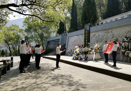 圖為敬獻(xiàn)鮮花 九峰烈士陵園始建于1956年,埋葬著20世紀(jì)50年代為國捐軀的120余位革命先烈。墓區(qū)內(nèi)青松翠柏環(huán)繞,墓前豎有一座“革命烈士永垂不朽”的石碑。上午10時許,祭掃儀式開始,全體人員懷著無比崇敬的心情向革命先烈鞠躬默哀,緊接著依次走到紀(jì)念碑前敬獻(xiàn)鮮花,表達(dá)對革命先驅(qū)的悼念與緬懷之情。在紀(jì)念碑前,全體黨員重溫入黨誓詞“我志愿加入中國共產(chǎn)黨,擁護(hù)黨的綱領(lǐng),遵守黨的章程......”