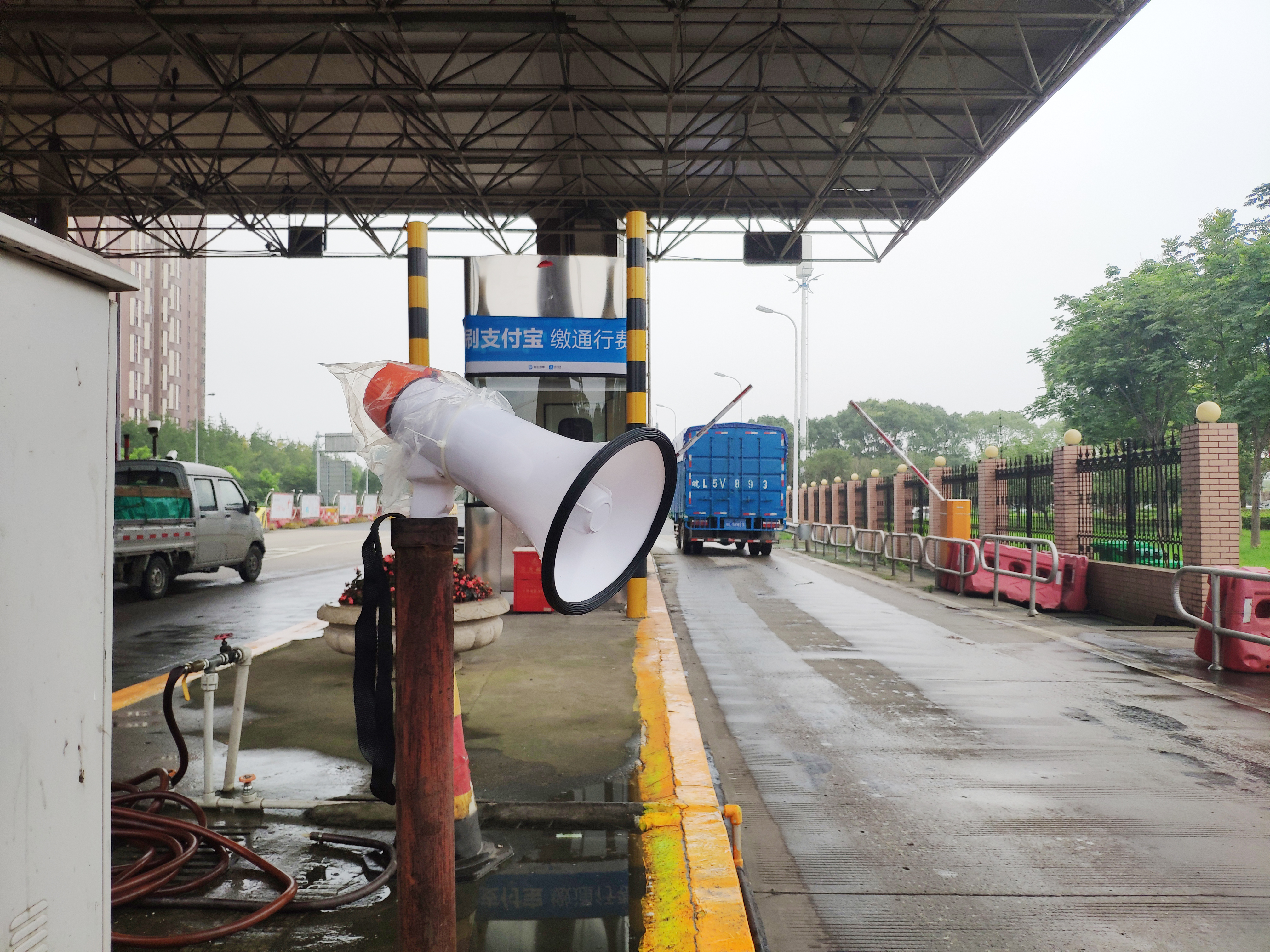 圖為入口處放置的語音警報小喇叭 在嚴把入口關(guān)中,該所要求入口必須有人員在崗,履行“一崗雙職”的重任,時刻關(guān)注入口情況,及時發(fā)現(xiàn)并勸阻違規(guī)車輛和人員的進入。此外,入口顯眼處懸掛“請珍愛生命,禁止行人和非機動車上高速”的警示標語。入口處增添放置的管控小助手---語音警報器,循環(huán)播放普通話和方言警示標語:“行人、自行車、摩托車禁止上高速公路”。入口安全島頭和邊溝處放置水碼,防止行人、摩托車、電動車和自行車從邊溝處和超寬車道進入高速。而由維養(yǎng)中心人員在入口高處安裝的攝像裝置,只要行人、自行車等非機動車輛出現(xiàn)在攝像范圍內(nèi),就會立刻傳來“警戒區(qū)域,請盡快離開”的持續(xù)性警報聲。在人員的管控和設(shè)備的警示下,收費所入口安全不斷地提升。