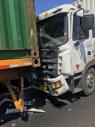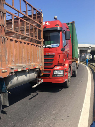上圖為事故車輛 當(dāng)天中午,在副站崗?fù)づ哉镜墓ぷ魅藛T發(fā)現(xiàn)該所前方出口不遠(yuǎn)處有貨車停在那里不動(dòng),以致后面車輛無(wú)法通行。工作人員隨即跑到前方查看情況,原來(lái)是三輛貨車發(fā)生追尾,其中有一輛車車頭被撞得凹陷,擋風(fēng)玻璃也被撞碎,在了解事故現(xiàn)場(chǎng)無(wú)人員受傷后,工作人員馬上向監(jiān)控中心匯報(bào)情況。由于事故車輛較大面積滯留,導(dǎo)致后方車子堵到主線上,一些不明情況的駕駛員在車?yán)锸箘虐蠢却叽?,現(xiàn)場(chǎng)充滿焦躁情緒。 如何盡快疏通道路?正在食堂吃飯的一班班長(zhǎng)潘慶耀放下碗筷跑到事故現(xiàn)場(chǎng),同工作人員叫前面受損較少的事故車輛先把車子開(kāi)出收費(fèi)站,再讓第三輛受損嚴(yán)重的車子試著發(fā)動(dòng)車子開(kāi)出去,所幸三輛車子都能開(kāi)離車道。在將地上的破損碎片清理到車道兩旁后,工作人員繼續(xù)指揮車輛向前行駛,收費(fèi)內(nèi)廣場(chǎng)在較短時(shí)間內(nèi)恢復(fù)了正常通行。 沈芬芳