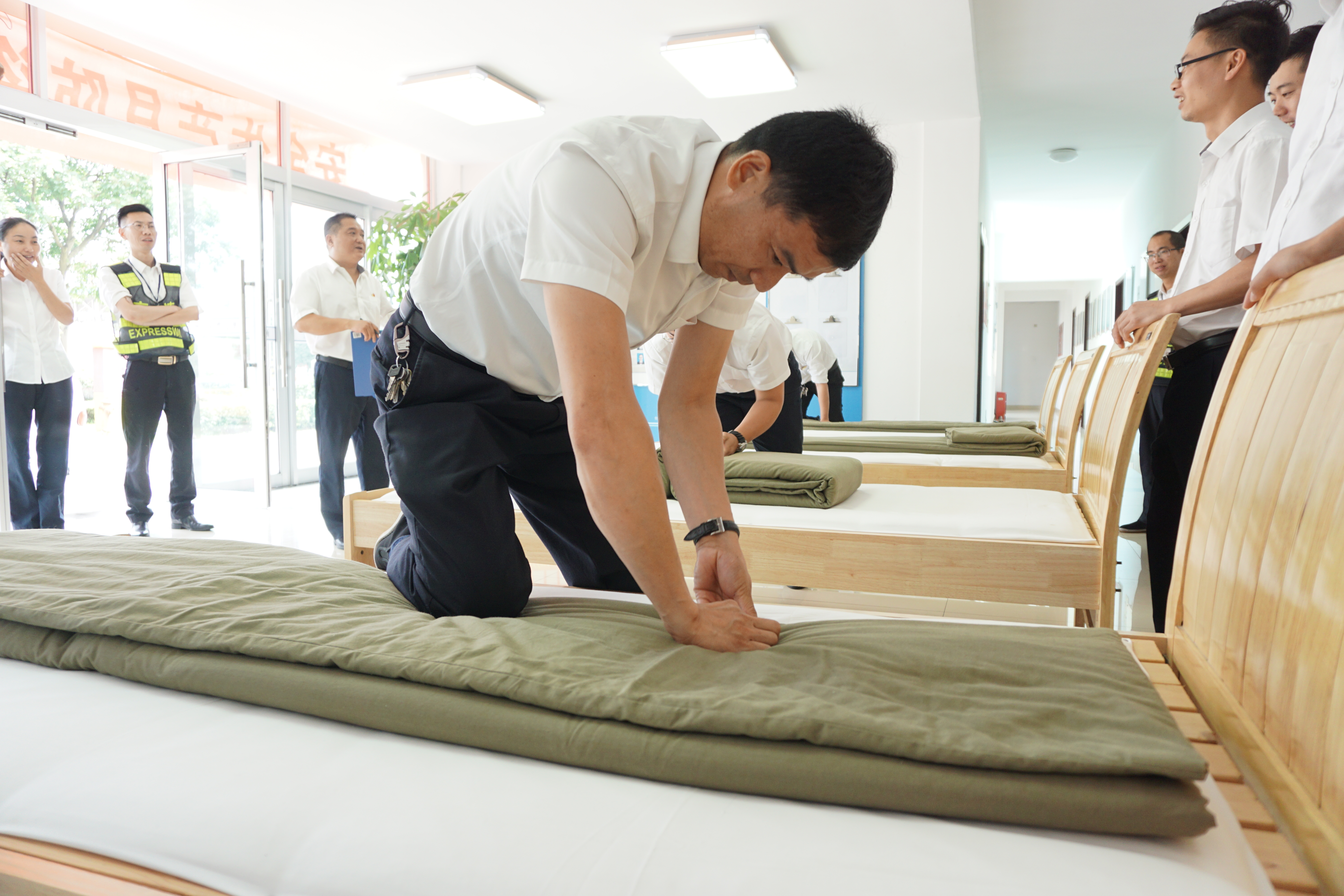 圖為比賽現(xiàn)場 活動現(xiàn)場,裁判宣布比賽規(guī)則及打分標準:評分從被子整體形狀、平整度、棱角明顯、折疊時間等方面判斷,規(guī)定在5分鐘內(nèi)完成,共設置一、二、三等獎三個獎項。內(nèi)務半軍事化在該所已是常態(tài),參賽選手們很快進入狀態(tài),從鋪到疊再到整,駕輕就熟,均能在規(guī)定時間內(nèi)整出“豆腐塊”。評委現(xiàn)場進行點評和打分。經(jīng)過競逐,最后副站收費四班何翊平奪得一等獎。比賽分四輪進行,且全程用時不到1個小時。