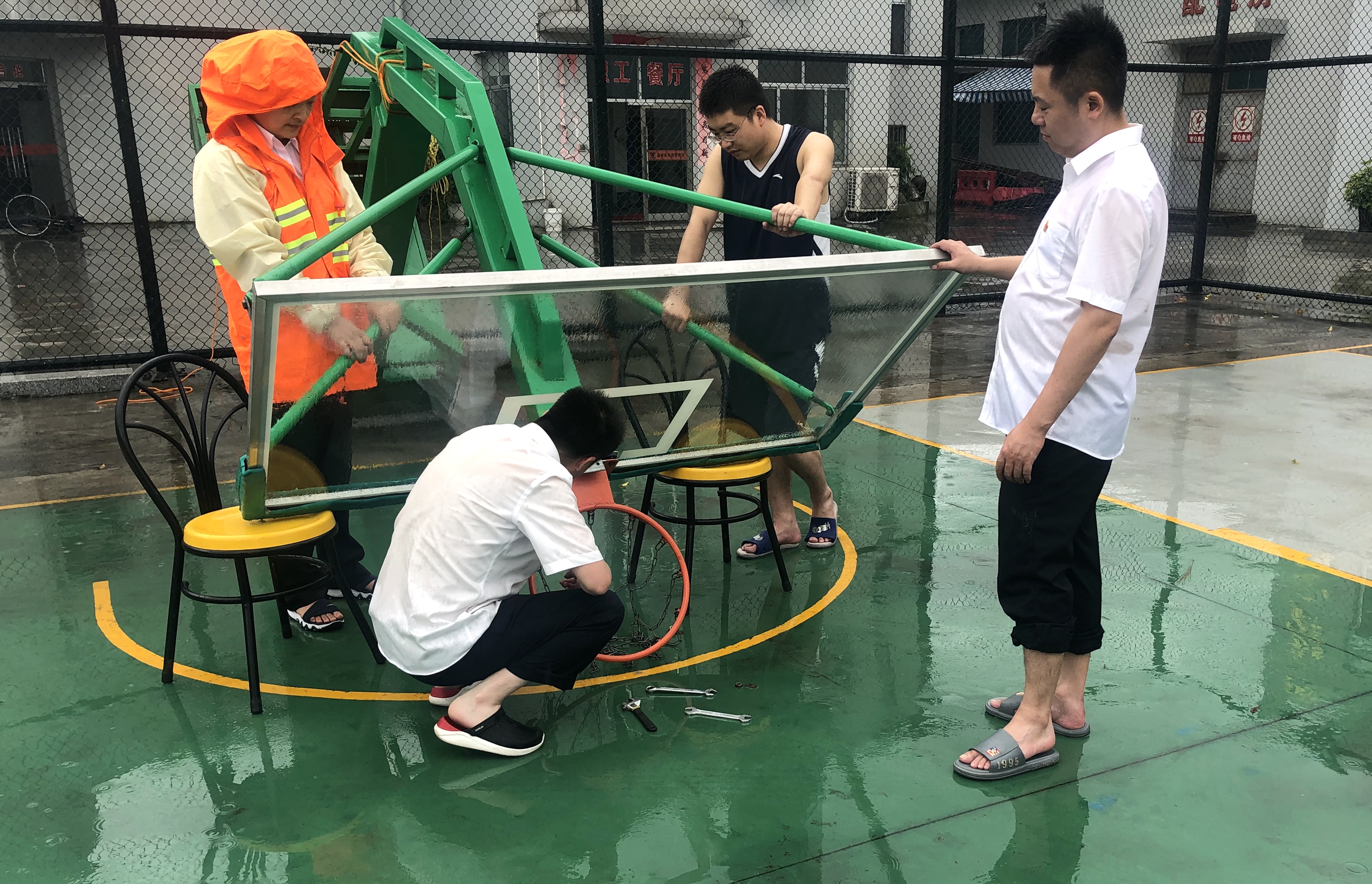 圖為所負責人帶領人員拆卸籃球架 此前,溫嶺西已經(jīng)做好基礎的抗臺防范工作,關閉所內(nèi)各寢室、辦公室門窗,提前裝好沙袋備用,準備好抗臺物資及近幾天的餐食,確保所內(nèi)各項事務正常運行。8月9日上午,該所長、副所長在臺風前做最后一次細致的排查,三人還親自動手將陽光房的窗戶都卸下來,避免風力太大,玻璃破裂,造成安全隱患。此外,為預防操場籃球架承受不住巨大風力,將籃球框拆卸下來,把籃球架放倒。其后通知所內(nèi)開車的人員將所有車輛停入操場中,以防止周邊樹木被風刮斷,造成車輛損失。 林夢灑
