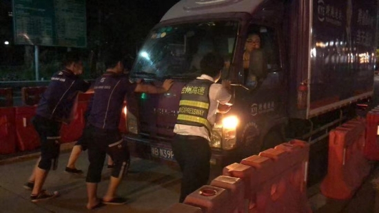 圖為收費(fèi)員幫助司機(jī)將故障車輛推出車道 8月15日凌晨1點(diǎn)多,溫嶺西收費(fèi)所征費(fèi)二班安全員在日常巡邏時(shí)發(fā)現(xiàn)一輛小型貨車停在進(jìn)口內(nèi)廣場(chǎng),在詢問司機(jī)后得知車輛因出現(xiàn)故障導(dǎo)致無法發(fā)動(dòng)。安全員當(dāng)即叫來旁站人員,與兩個(gè)司乘人員一起用力,慢慢地將該車推出車道。在婉拒了司機(jī)遞香煙的好意后,安全員囑咐司機(jī)盡快聯(lián)系人員前來解決,后回到崗位繼續(xù)工作。