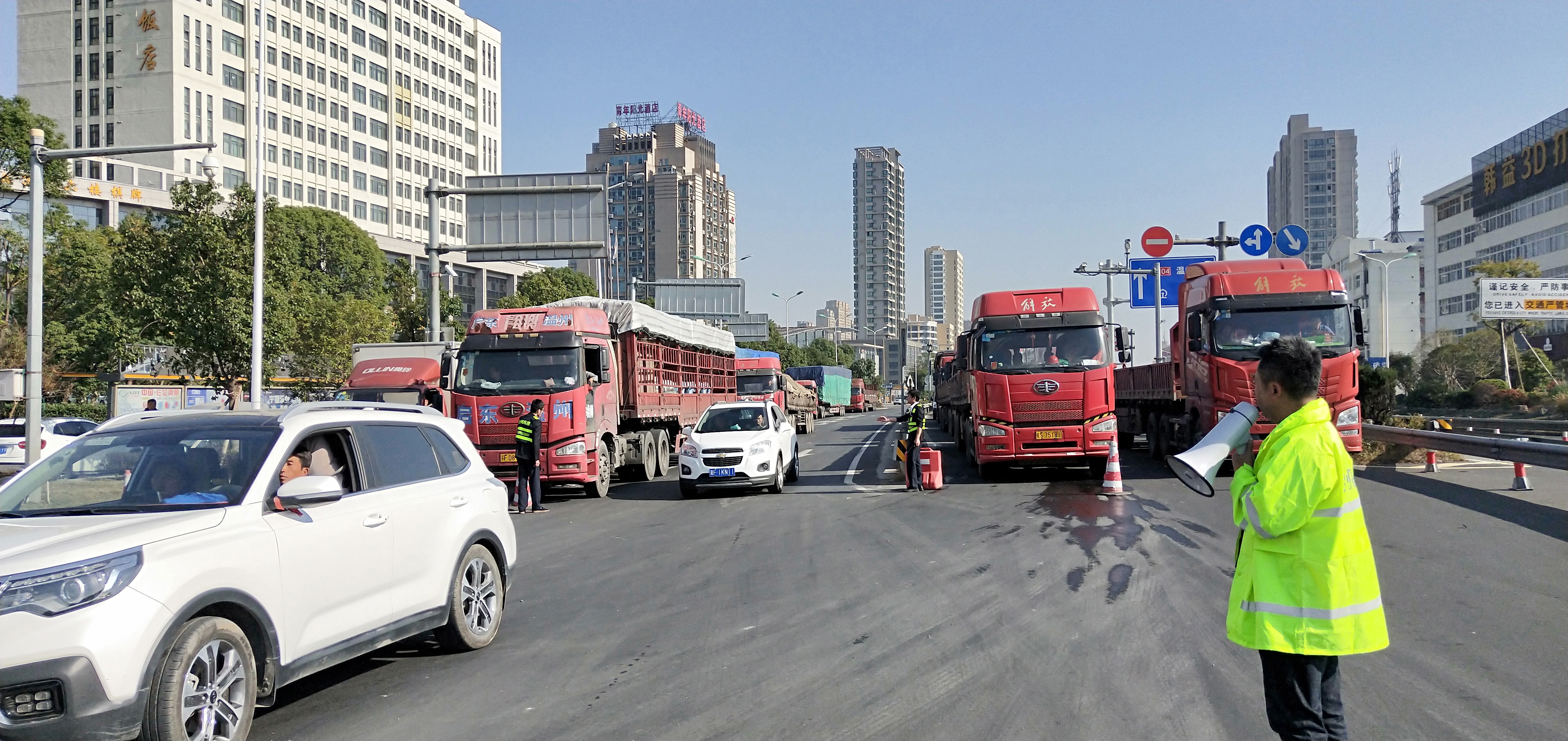 圖為所班子成員帶頭指揮交通 早上8點(diǎn)11分,接到監(jiān)控中心電話:入口開通,開足兩個(gè)人工車道。當(dāng)時(shí)正值新收費(fèi)模式開通前對稱重超限車輛勸返工作的開始。經(jīng)過幾個(gè)小時(shí)封道,此時(shí)的入口車流已經(jīng)一望無際,如果碰到超限車輛,勸返更是難上加難。 在困難中想對策,所領(lǐng)導(dǎo)班子成員提出“輪流式放行”:入口的車輛分別是從橋上和橋下過來,分為4個(gè)車道,每個(gè)車道輪流放行5分鐘,這樣井然有序,不容易造成擁擠和交通事故,并且可以快速放行。每個(gè)車道前都擺放了一個(gè)小紅帽,專人看守。其他人員分別在入口指揮,藍(lán)牌貨車和未安裝ETC的車輛從大小客車車道通行,大貨車從混合車道通行,裝有ETC的客車和集裝箱走ETC專用通道。大家不斷穿梭在車道、廣場之間,向司機(jī)一遍遍耐心解釋,指揮每一輛車順利通行。1名孕婦行動(dòng)不便,被分在監(jiān)控室接聽電話,查詢?nèi)肟跓o信息的車道。所有人一身汗,忙得顧不上喝一口水,臨近飯點(diǎn)也沒有人主動(dòng)去吃飯,大家都頂住壓力,從黎明到黃昏一心想著快速準(zhǔn)確高效放行。