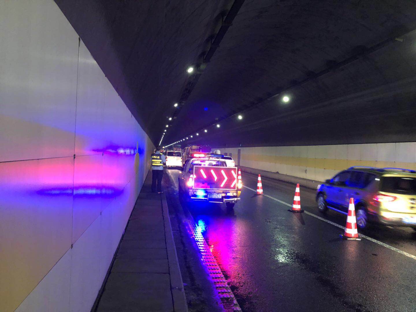 7月14日19時22分,中控員朱金飛發(fā)現(xiàn)黃土嶺寧向隧道1000米快車道處有車拋錨。立刻呼叫執(zhí)勤隊(duì)前往處置,隨即更改快車道交通信號。 執(zhí)勤隊(duì)迅速出警,幾分鐘后就趕赴事故現(xiàn)場,發(fā)現(xiàn)一輛白色面包車撞在隧道內(nèi)右側(cè),車輪箍嚴(yán)重受損,卡在護(hù)溝里,所幸無人員受傷。執(zhí)勤隊(duì)進(jìn)行提前預(yù)警,預(yù)防二次事故的發(fā)生,并呼叫高速施救車輛支援,幾分鐘后施救車抵達(dá),事故車輛安全拖離隧道,僅僅十分鐘,交通就恢復(fù)暢通。