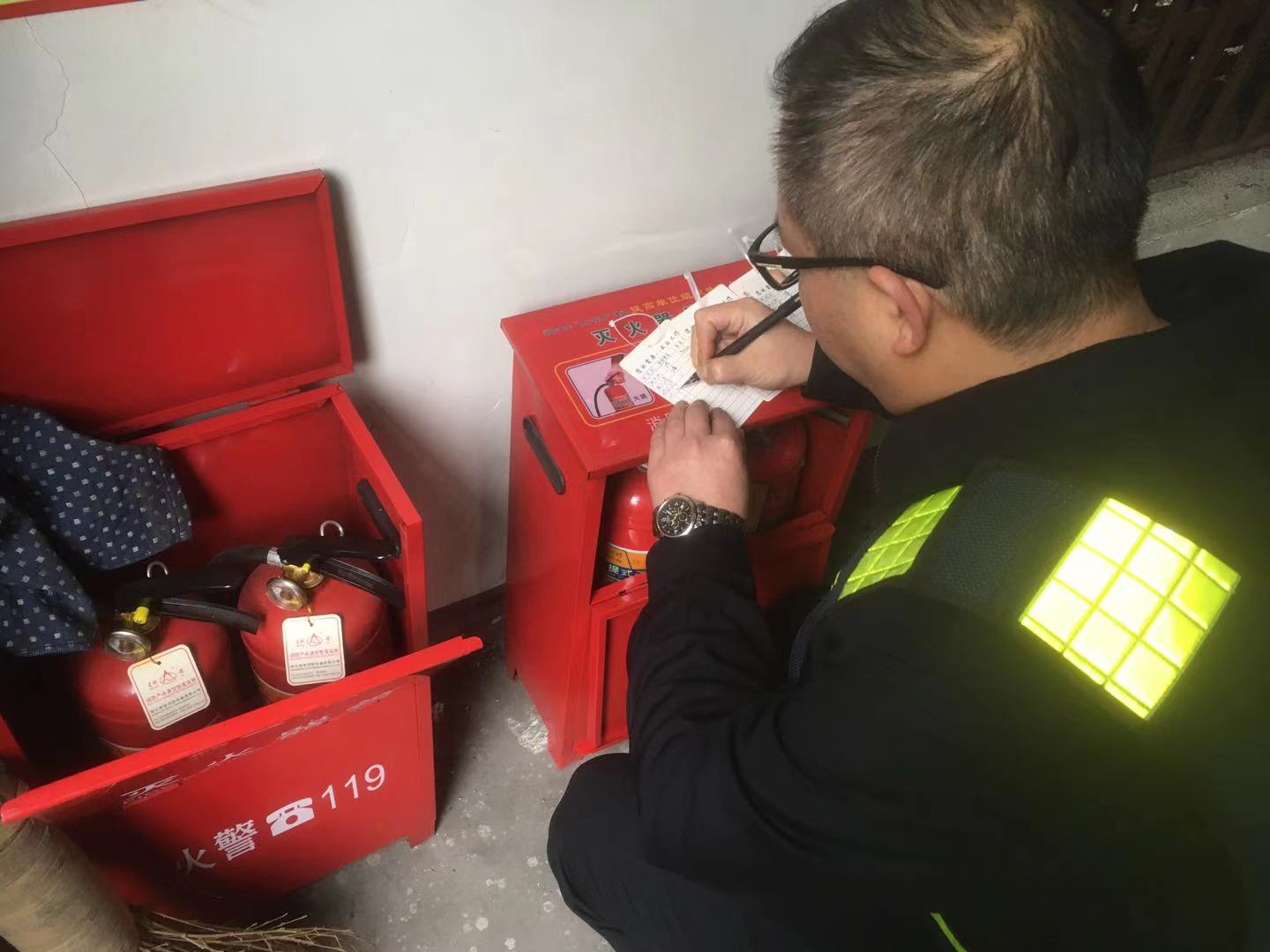 (圖為工作人員檢查滅火器)