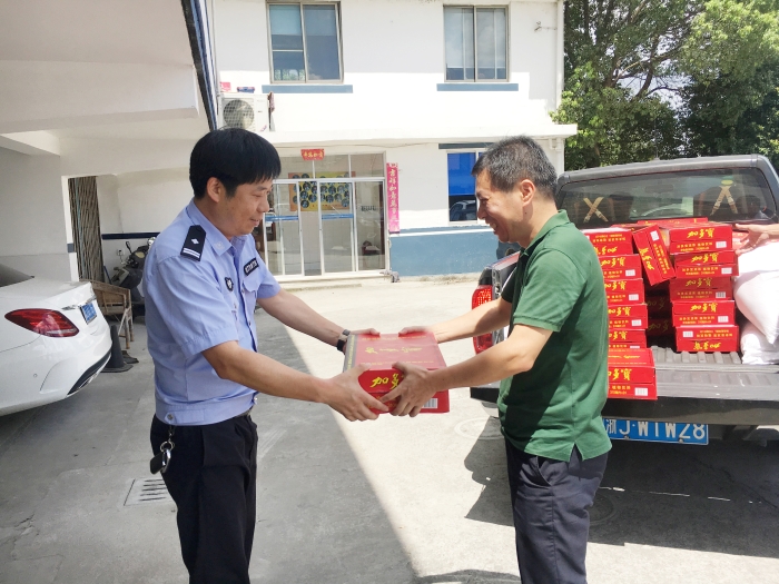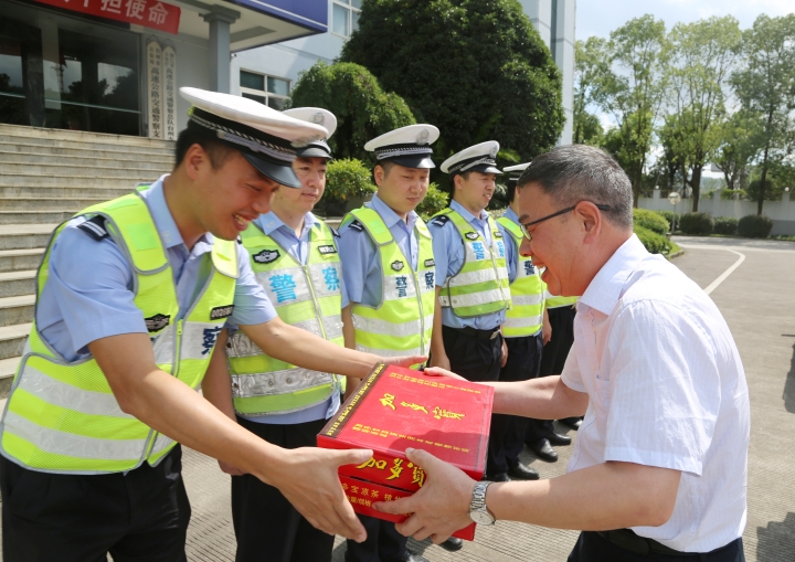 與此同時,集團總工程師江輝帶領(lǐng)工程部及收費所相關(guān)人員到院橋派出所和交警隊開展“送清涼”活動。江輝代表臺州高速集團對當?shù)嘏沙鏊徒痪牭穆穆毐M責、通力協(xié)作表示衷心感謝,并叮囑他們在高溫天氣要做好防暑降溫工作。