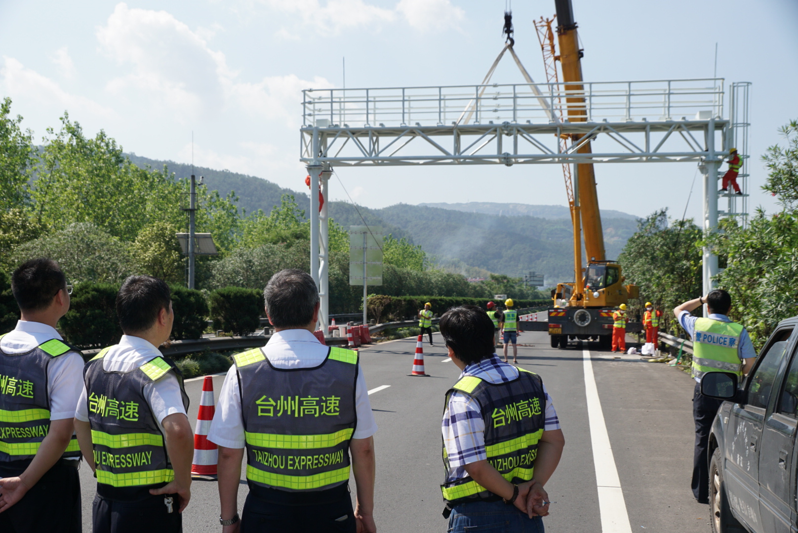 9月7日上午,首個自由流主線虛擬收費(fèi)站龍門架,在甬臺溫高速公路臺州段溫州方向主線K1668+200M處現(xiàn)場完成吊裝,標(biāo)志著取消省界收費(fèi)站工作邁出了堅實的一步。集團(tuán)董事長、總經(jīng)理陳文波在吊裝施工現(xiàn)場視察指導(dǎo)工作。集團(tuán)總工程師江輝,高速交警、施工單位、監(jiān)理單位、工程部等人員陪同。