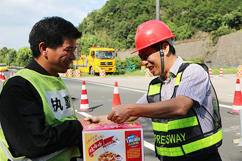 圖為集團(tuán)總工程師江輝為交通疏導(dǎo)員送上慰問(wèn)品 大溪嶺隧道溫向隧洞中,施工人員正在拆除原設(shè)備,除了噪音和洞中彌漫的灰塵,高溫高濕的環(huán)境也嚴(yán)重考驗(yàn)著施工人員的身心。江輝提著慰問(wèn)品,向隧洞中和烈日下正在崗位上工作的施工人員和交通疏導(dǎo)員送上慰問(wèn)品。考慮到一線人員的特殊情況,江輝特別要求采購(gòu)人員將送清涼物資改為八寶粥、蛋黃派、飲料等可以直接食用的物資,方便施工人員可以隨時(shí)補(bǔ)充能量。