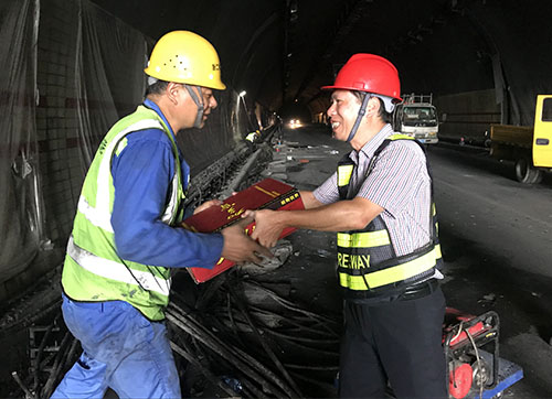 圖為集團(tuán)總工程師江輝給隧道內(nèi)施工人員送上慰問(wèn)品