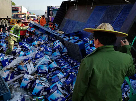 8月25日凌晨4點(diǎn),甬臺(tái)溫高速溫向1648+7路段,一輛運(yùn)啤酒的大貨車(chē)因司機(jī)疲勞駕駛,導(dǎo)致車(chē)輛撞上中央護(hù)欄而側(cè)翻,啤酒灑滿一地,后方兩輛貨車(chē)避讓不及造成多車(chē)事故。