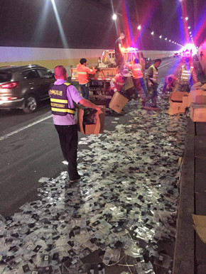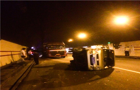 這輛“始作俑者”的車輛由于司機(jī)疲勞駕駛,不慎撞擊隧道壁而引發(fā)側(cè)翻,雖然該車內(nèi)無人員受傷,可是跟隨其后的拖掛車就沒那么幸運(yùn)。拖掛車司機(jī)看到前方出狀況,當(dāng)即采取緊急制動,剎得太急又致使后方小貨車追尾,導(dǎo)致該車車頭嚴(yán)重受損,司機(jī)的手臂受了傷,運(yùn)輸?shù)匿X塊也撒了一地。
