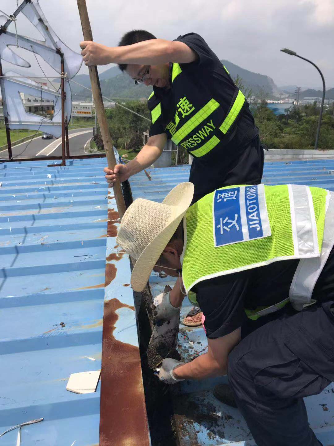 圖為工作人員清除收費頂棚垃圾 及時下降各收費所互通區(qū)高桿燈。為提升互通區(qū)照明亮度,減少因選錯路口而帶來的不必要的麻煩,集團在各收費站出入口互通區(qū)共安裝了11盞40米高度高桿燈,每盞高桿燈上方有12盞鈉燈。倘若這些高桿燈上鈉燈在臺風襲擊下一旦掉落后果將不勘設想。8月8日,中心再次召集各班人員對收費沿線高桿燈進行了下降處理。因高桿燈四周雜草叢生,在下降時維修隊員不僅要忍受底下蚊蟲肆意叮咬,還要克服時而烈日時而大雨的怪異天氣,沒放幾盞隊員便濕透了全身,衣服是濕了又干,干了再濕。