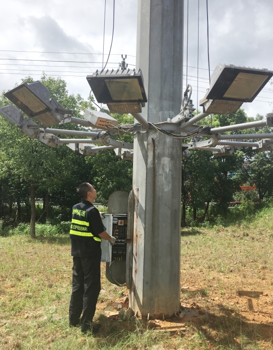 圖為工作人員下降各收費所互通區(qū)高桿燈 增強機電設備防水措施。集團收費站有很多機電設備直接安裝在戶外,因外層有開關(guān)柜保護,一般雨水是無法滲透的。可一旦遇上臺風雨等惡劣天氣就很難確保內(nèi)部設備不會被打濕,尤其是計量柜里面的計重設備,一旦短路損壞會立即造成車輛擁堵。因此,剛完成高桿燈下降工作的中心隊員顧不上休息,又馬不停蹄趕赴收費所將計量柜、欄桿機等重要設備用封帶紙進行密封處理,不漏過任何一處可能進水的地方,大大增強了這些設備防水性能。