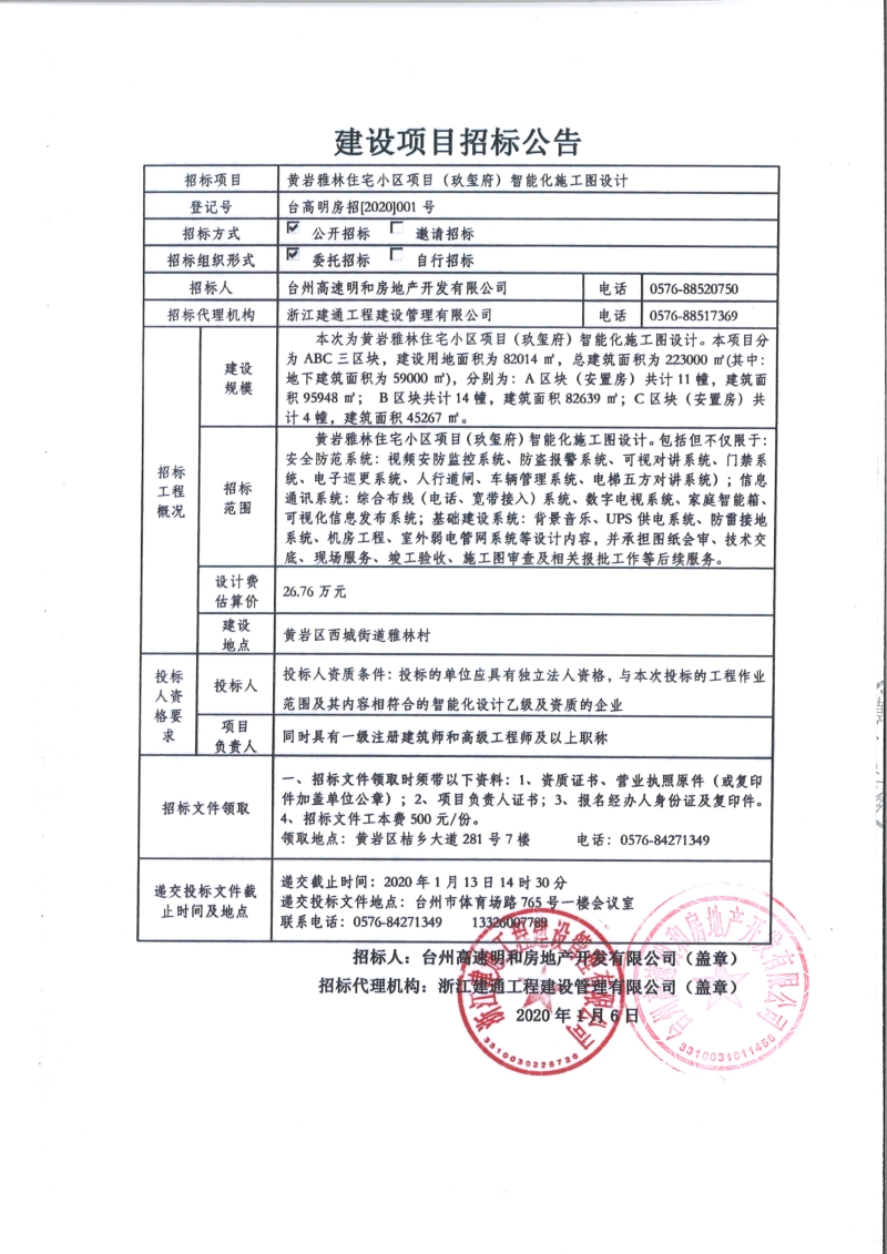 黃巖雅林住宅小區(qū)項目(玖璽府)智能化施工圖設計招標公告