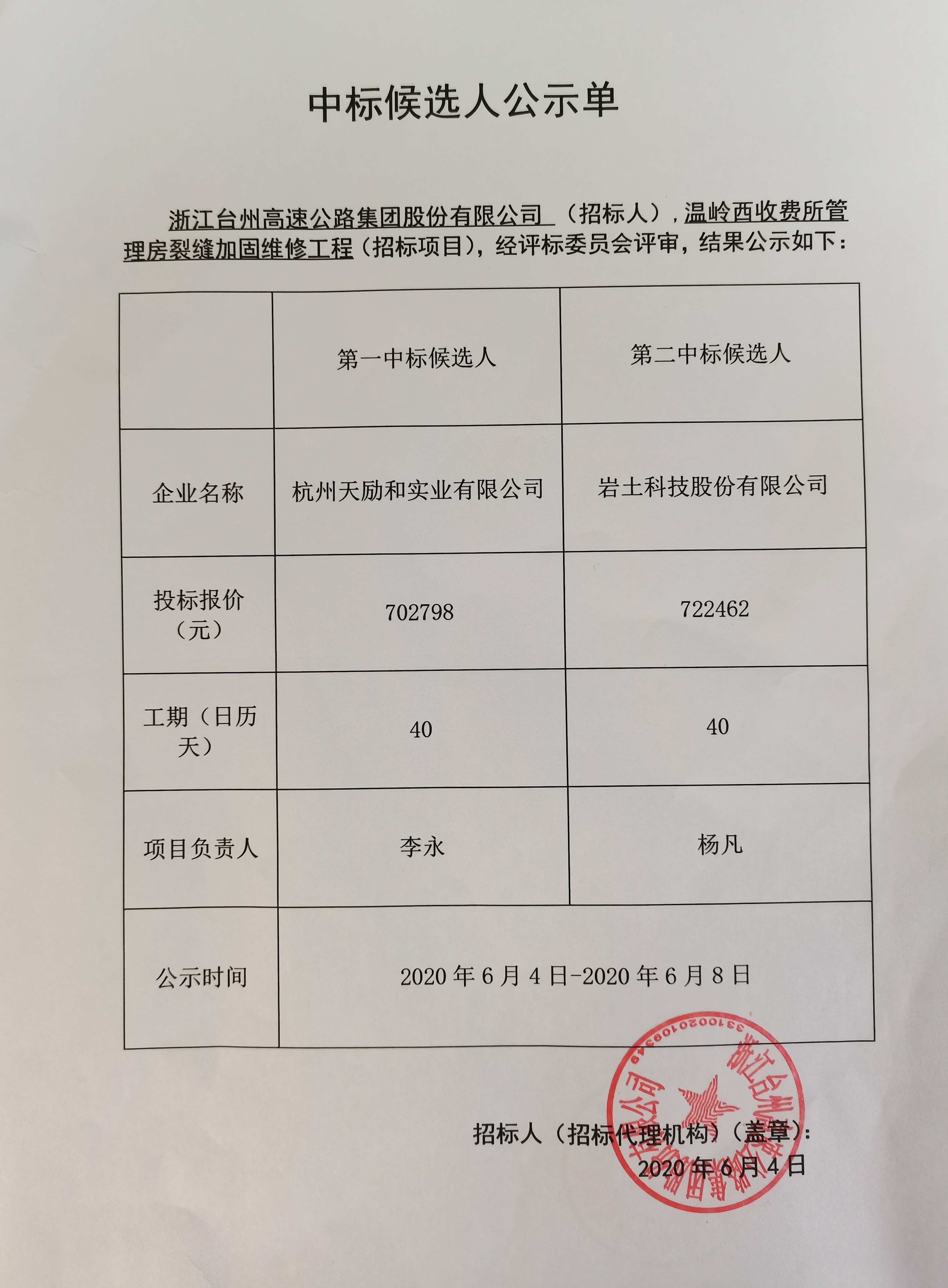 溫嶺西收費(fèi)所管理房裂縫加固維修工程中標(biāo)候選人公示單