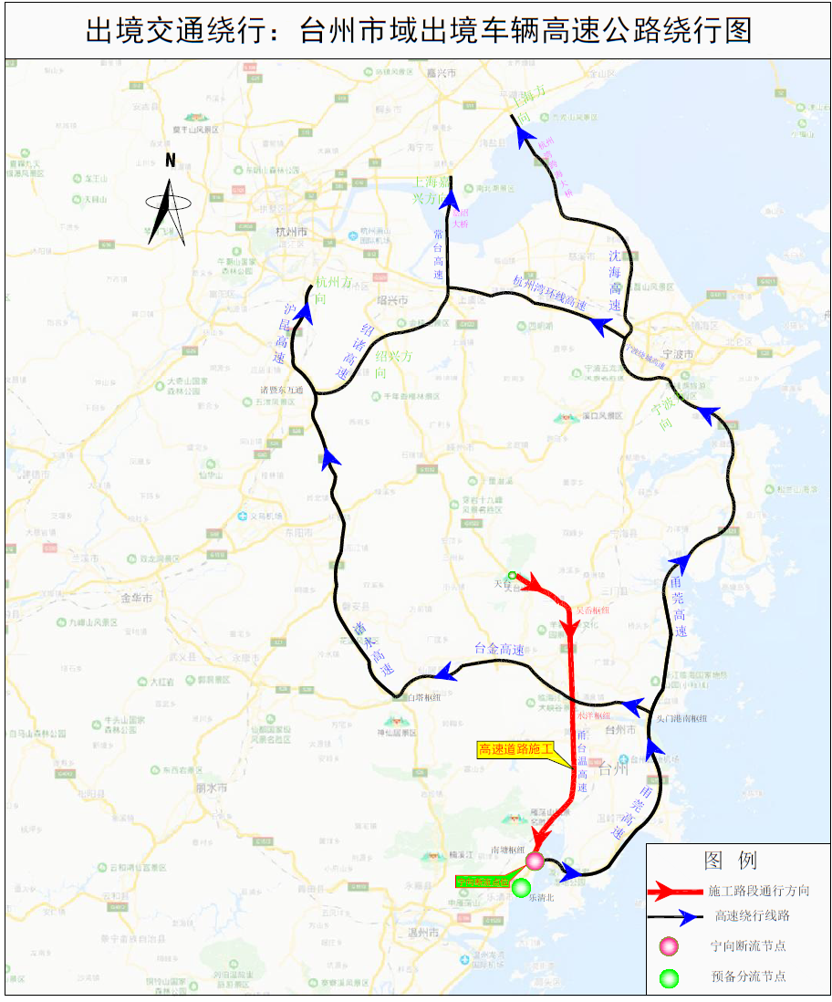 臺州往上海、杭州、嘉興、紹興線路:通過甬莞高速(或臺金高速)沿線互通上高速→臺金高速→諸永高速繞行。