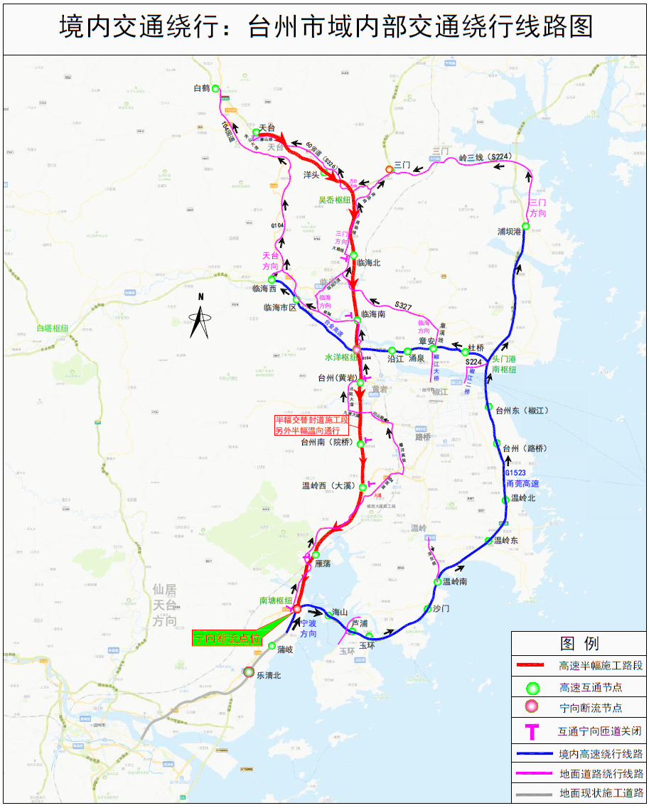 在甬臺溫高速寧波方向南塘樞紐進行斷流,所有車輛改走甬莞高速;甬莞高速南塘樞紐轉甬臺溫高速寧波方向匝道關閉;臺金高速水洋樞紐轉甬臺溫高速寧波方向匝道關閉;甬臺溫高速溫州方向吳岙樞紐轉上三高速上虞方向匝道關閉;甬臺溫高速溫州方向、上三高速三門方向保持通行,部分路段借用對向車道通行。