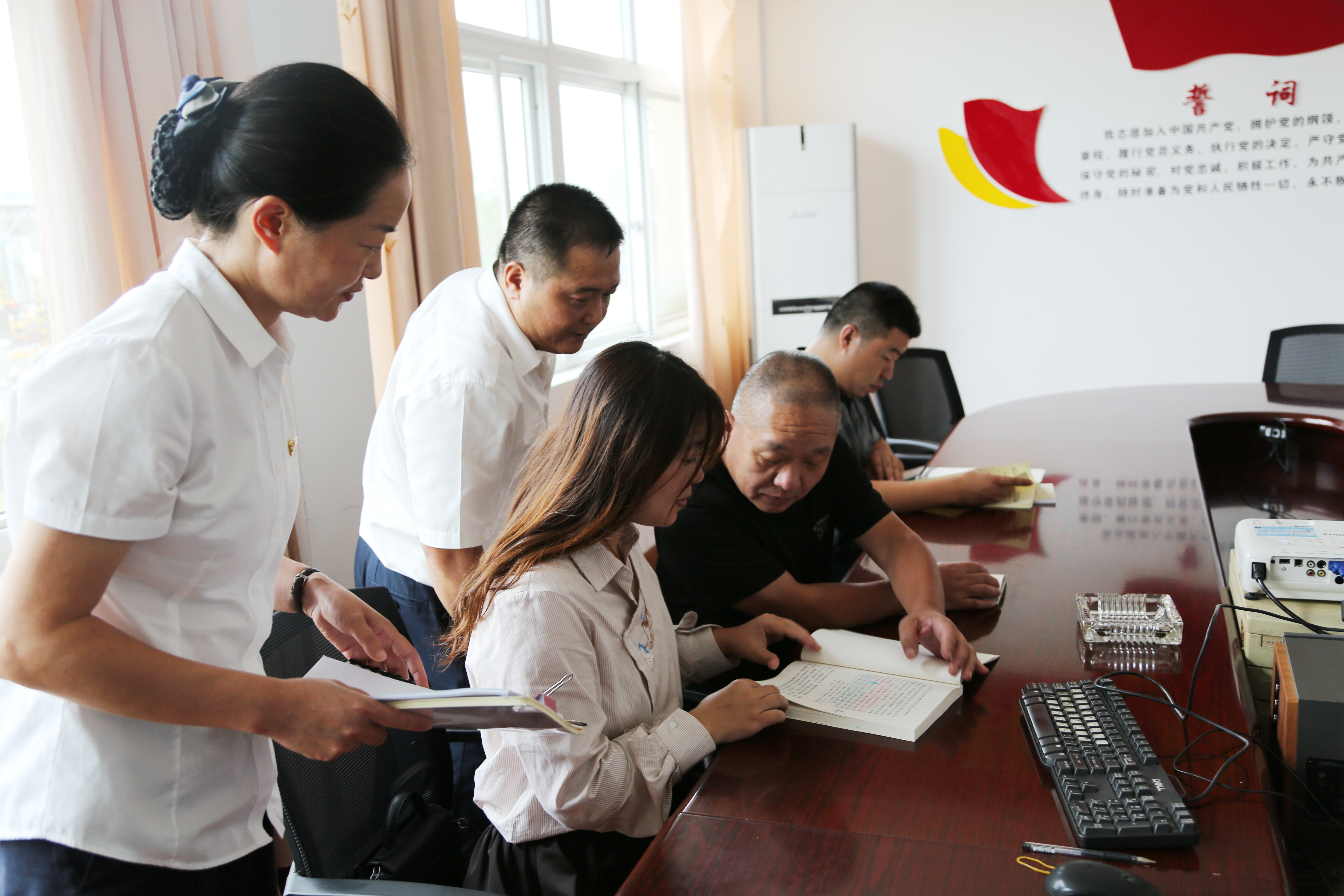圖為督查組人員檢查學習資料 督導工作采取了檢查標準、檢查內(nèi)容與市委指導組保持一致、與集團黨委主題教育工作計劃安排時間節(jié)點同步跟進的辦法,聽取各黨支部自9月12日該項工作啟動以來,黨員干部參加主題教育學習、“我是黨員我?guī)ь^”專題討論、加強與實際工作結(jié)合等方面的情況匯報,以及查看會議記錄和黨員筆記,現(xiàn)場隨機提問應知應會知識要點。同時,隨機抽查了30余位黨員對《習近平關(guān)于“不忘初心、牢記使命”論述摘編》和《中國共產(chǎn)黨章程》“一書一章”圈重點、作標記、寫批注情況,以及20余名黨員掌握主題教育基本知識情況。