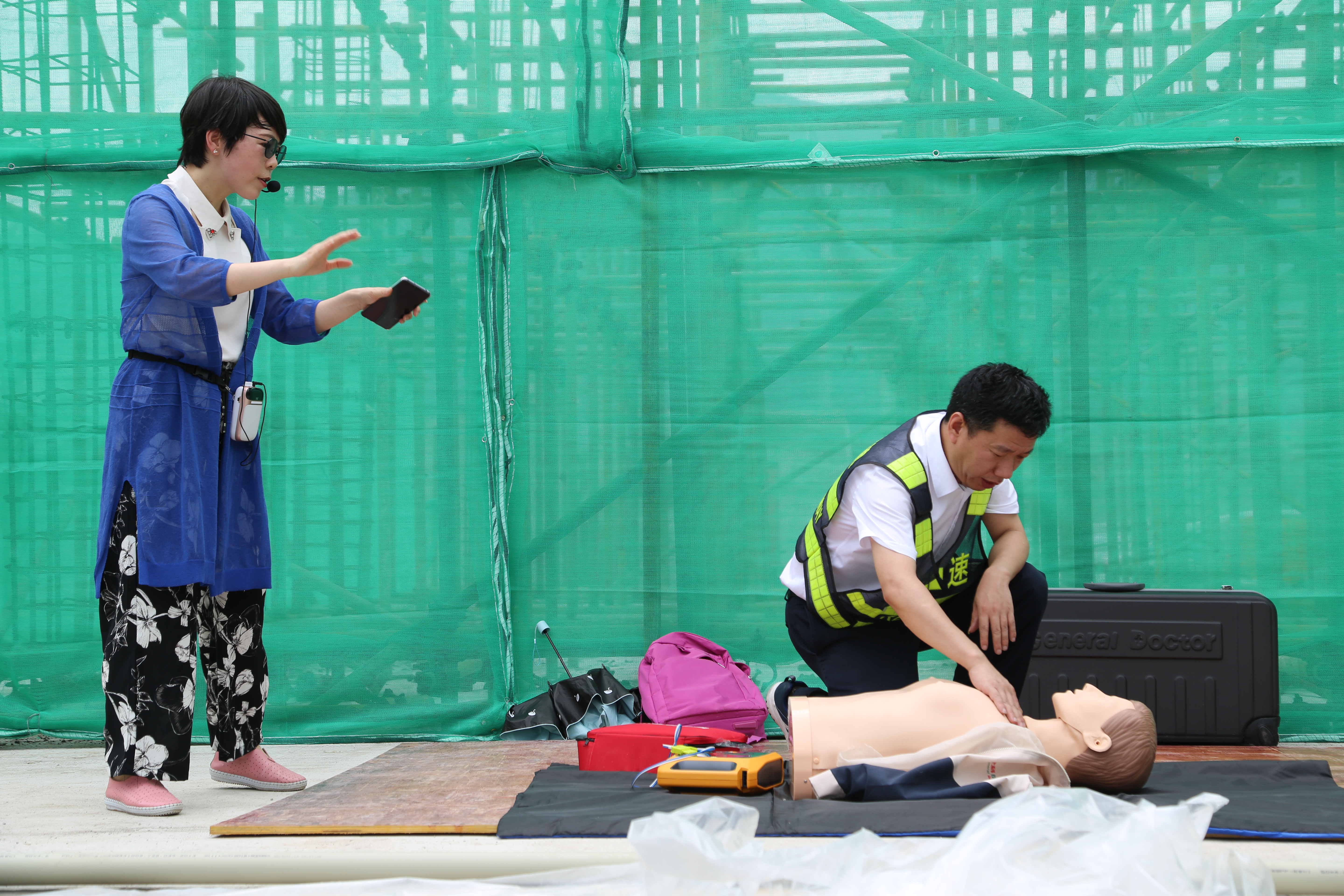 此次演練的第二項(xiàng)重頭戲是心肺復(fù)蘇術(shù)培訓(xùn),建筑工地多為臨時(shí)工棚且露天作業(yè),受臺(tái)風(fēng)影響較大,心肺復(fù)蘇對(duì)于遭遇意外的施工人員來說如同救命稻草。高速集團(tuán)安保部邀請(qǐng)了臺(tái)州職業(yè)技術(shù)學(xué)院副教授李美芬到演練現(xiàn)場(chǎng)進(jìn)行心肺復(fù)蘇術(shù)培訓(xùn),李美芬詳細(xì)講解了心肺復(fù)蘇術(shù)和AED的理論知識(shí)、操作要領(lǐng)和具體方法,并規(guī)范熟練地進(jìn)行了現(xiàn)場(chǎng)演示。隨后參與演練的各部門代表上臺(tái)學(xué)習(xí)實(shí)操,李美芬細(xì)心指導(dǎo)每一個(gè)動(dòng)作,耐心講解每一個(gè)要點(diǎn),教學(xué)效果顯著,有效提高了參演人員的急救技能。