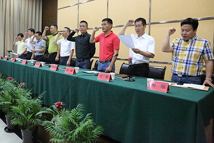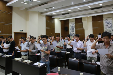 圖為參會人員集體宣讀誓詞 會上,內(nèi)環(huán)路(黃巖段)各標段的施工單位、監(jiān)理單位主要負責人根據(jù)各標段的工程推進現(xiàn)狀,針對2017年11月11日主線通車的目標進行了表態(tài),承諾在最后的150天時間里,倒排工期,掛圖作戰(zhàn),確保在市委市政府規(guī)定的期限前完成主線通車任務,為臺州市民交上一份滿意的答卷。 周一鳴